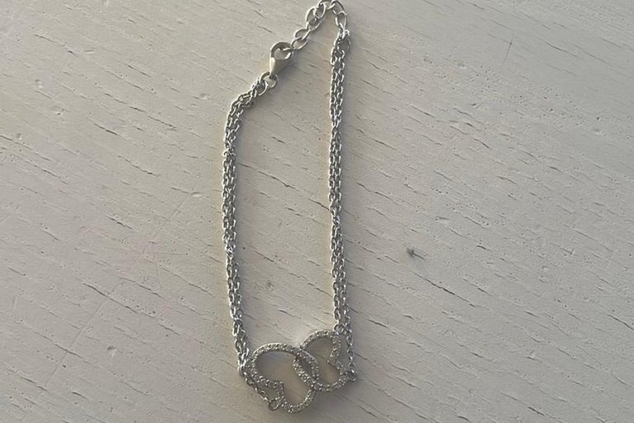 Fint armband med två sammanlänkade hjärtan. Armbandet är i silverfärgad metall.