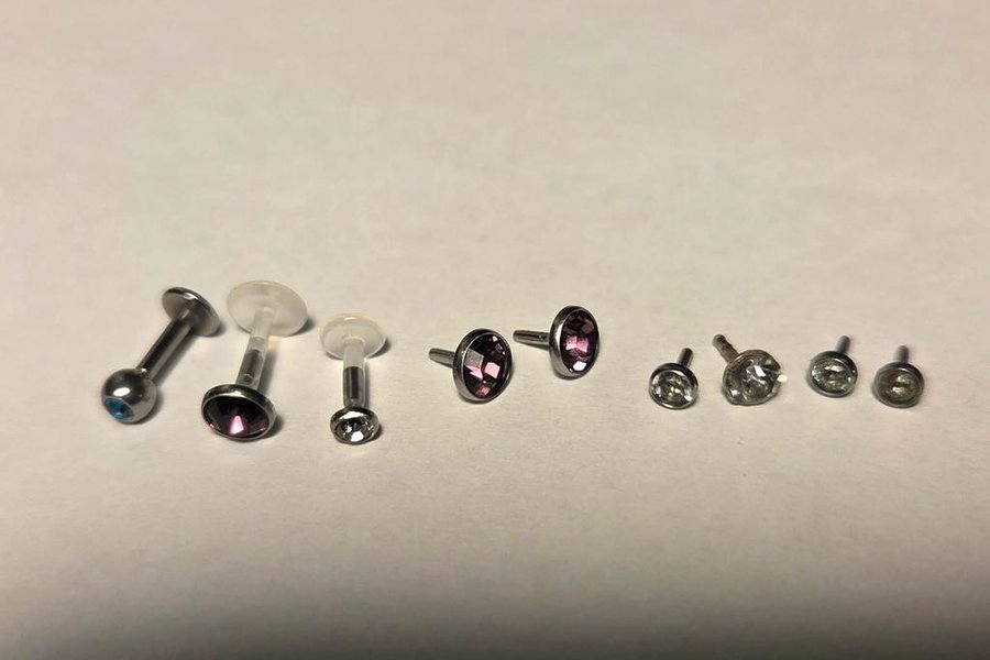 Paket med nya labretter av typen push-fit + strasstenar som passar till dem - för t.ex näspiercing i näsvinge, monroe/mouche eller philtrum/medusa + en labrett i kirurgiskt stål.