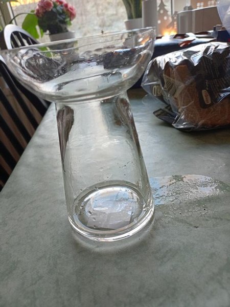 Skål i glas på fot.vas att ha vät i kan varieras mycket med pynt höjd ca 20 cm. Inköpt på Wedbergs blommor, då med un liten växt i samt kottar i botten.