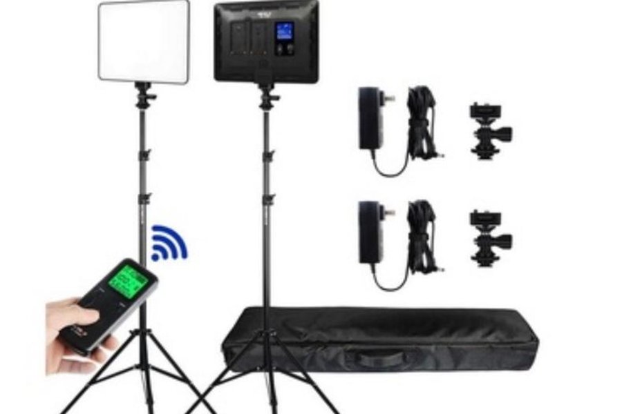Komplett LED videobelysning set med två lampor, stativ, fjärrkontroll, strömadaptrar, fästen och väska.
