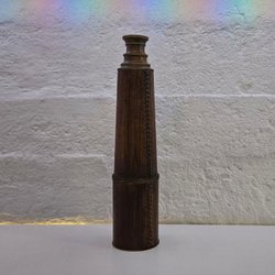 Stadig gedigen pjäs som väger strax under 1,2 kilo & nästan blir 1 meter (98cm) fullt utdragen. 28cm infälld & ca 7cm i diameter. Gissningsvis gjord i mässing & klädd i tjockt läder.