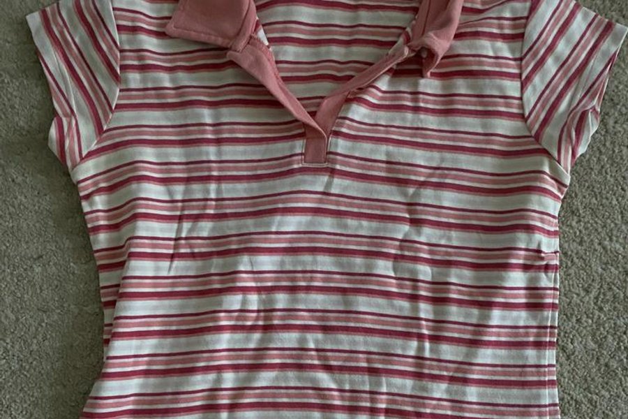 En kortärmad pikétröja med horisontella ränder i vitt, ljusrosa och mörkrosa/rött. Tröjan har en klassisk pikékrage och en kort knappslå i ljusrosa.
