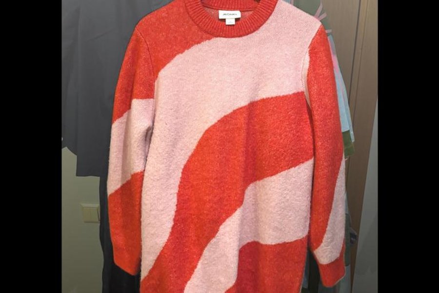 Stickad klänning från Monki med ett vågigt mönster i rosa och rött.