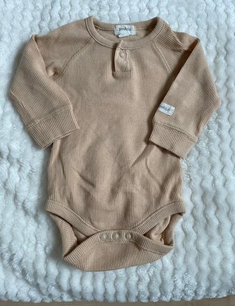 Ljusbrun baby body med lång ärm och tryckknappar nedtill samt vid halsen. Knappt använd