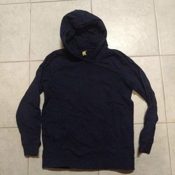 Långärmad body med tryckknappar vid axeln och grenen. Bodyn har ett randigt mönster i mörkblått och vitt. Knapparna lite nötta och finns en liten fläck framtill.