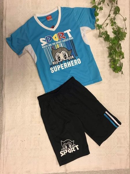 Snyggt sportset för barn med tryck av en tecknad figur. Setet inkluderar en t-shirt med v-ringning och shorts. Perfekt för aktiva dagar!