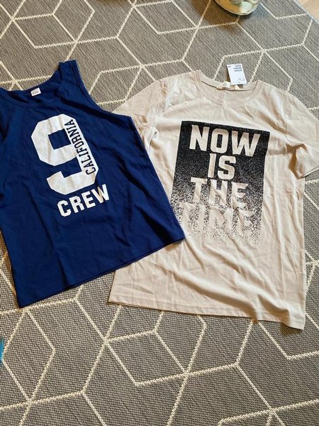 Ett set med två tröjor. En mörkblå tanktopp med texten "9 CALIFORNIA CREW" tryckt på framsidan. Den andra är en ljusbeige t-shirt med texten "NOW IS THE TIME" tryckt på framsidan.Från Lindex och HoM.158/164 på linnet 170 på t-shirten.Lappen kvar.