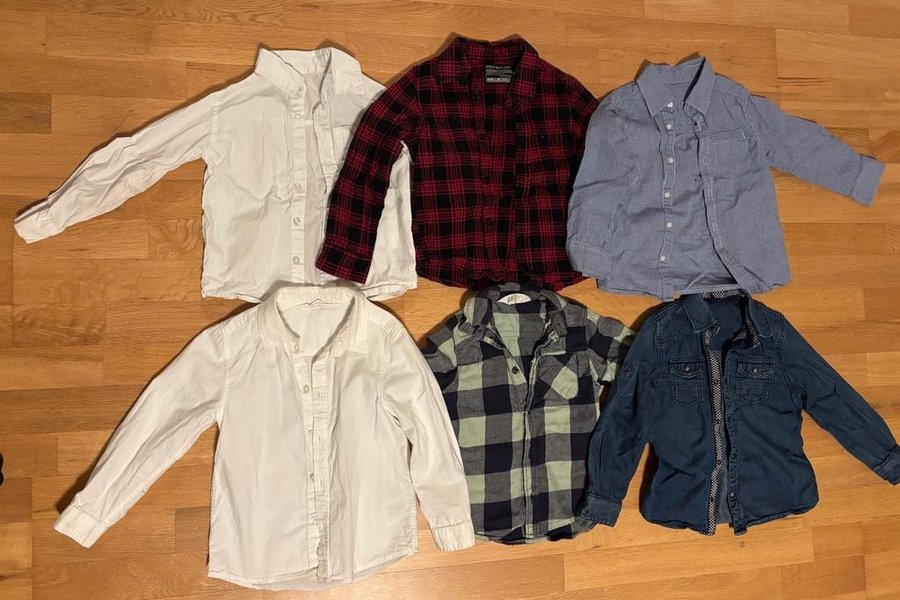 Ett set med sex skjortor för barn. Inkluderar två vita skjortor, en röd och svart flanellskjorta, en blå skjorta med små mönster, en grön och svart flanellskjorta och en mörkblå skjorta.