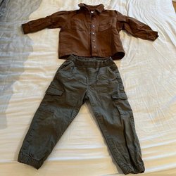 Set med en brun skjorta och ett par gröna byxor. Skjortan har knappar framtill och fickor på bröstet. Byxorna är av cargomodell med resår i midjan och muddar vid bensluten.
