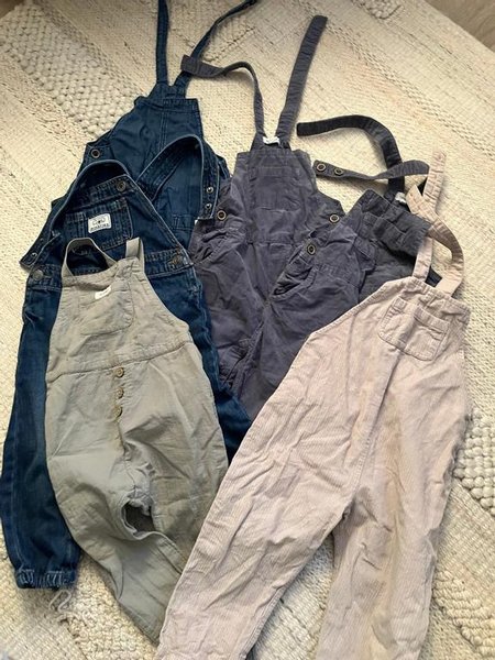 Ett set med sex par barnoveraller i olika färger och stilar. Setet innehåller en mörkblå denimoverall, en grön overall med knappar, två mörkgblå overall med justerbara remmar och två ljusbeige manchesteroverall.