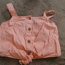 Söt, korallfärgad sommartopp (kort linne) med knäppning fram och knytning nedtill.