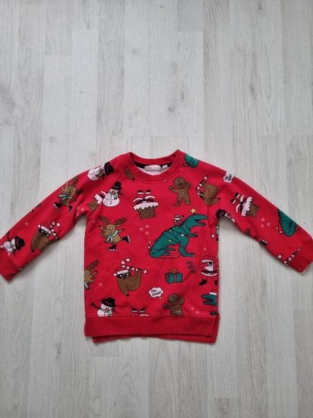 En röd långärmad tröja med ett festligt julmönster.