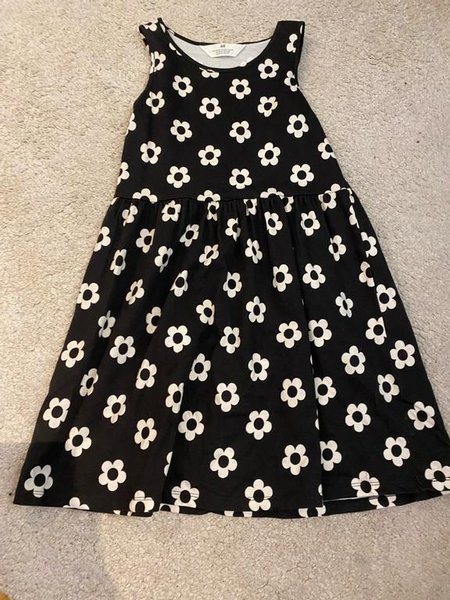 Svart klänning med vita blommor. Klänningen är ärmlös och har en rynkad kjol. storlek 134-140