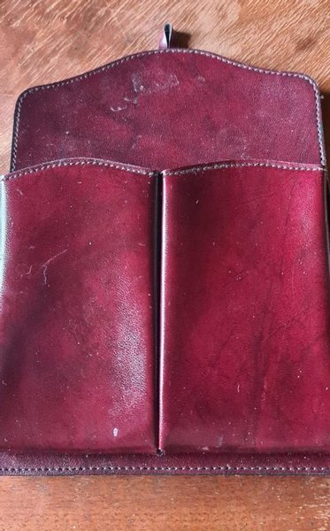 Ett förvaringsfodral i läder. Två fack lämplig för exempelvis glasögon, mindre mobiler. Ögla för upphängning på vägg. Fickans innermått 6 x 12 cm. Totalt mått 20x15 cm.