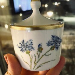 En vacker koboltblå blomkruka från Steninge Keramik, modell 92-2. Finns någon liten flisa somär borta i överkanten, men inget som stör. Glasyren är sådan att lergodset syns som små prickar. 13 cm hög och 14 cm i diameter.