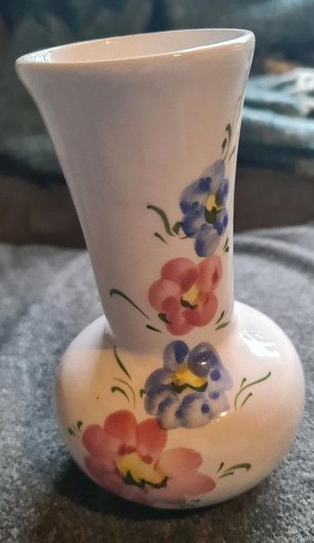 Vit vas med blommor i blått och rosa. Gröna blad och detaljer. Vasen har en smalare hals som vidgas upptill och en rundad bas. Ca 17 cm hög. Fint skick.