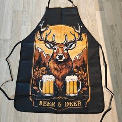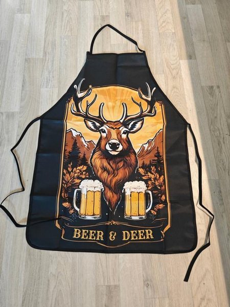 Ett svart förkläde med tryck av ett rådjur och texten "Beer & Deer".