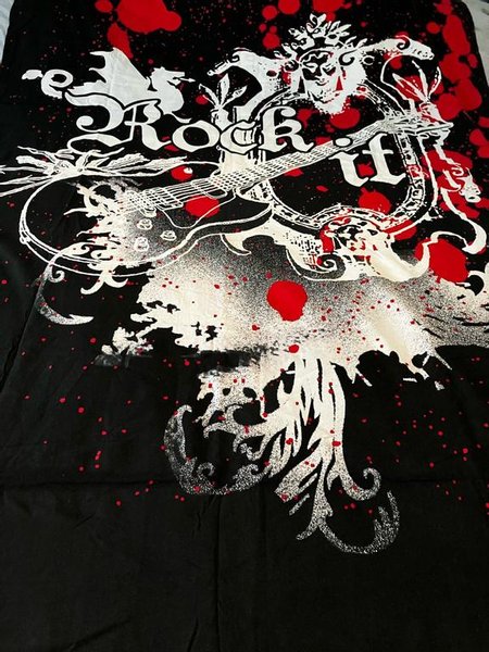 Påslakan med ett tryck i vitt och rött. Trycket föreställer bland annat en gitarr, en drake och texten "Rock it".200x127cm.Knappar saknas nertill,annars fint skick.