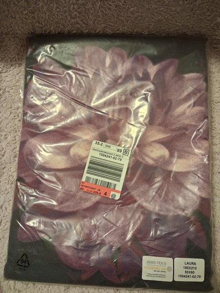 Ett helt nytt påslakanset, ett påslakan + ett örngott i bomull. Lila blommor mot svart bakgrund.
