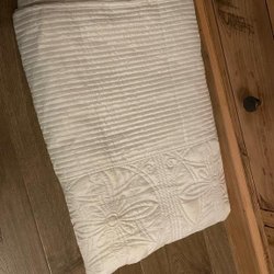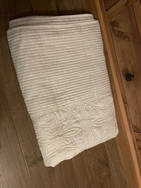 Ett vitt överkast med blommönster. Passar 140 säng om det randiga hänger ner. Annars går ju även 120-160. Som nytt. Lättviktigt