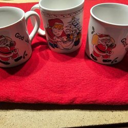 Tre julmuggar med olika tomtemotiv och texten "God Jul". 1 mugg har ett litet nagg i kanten.
