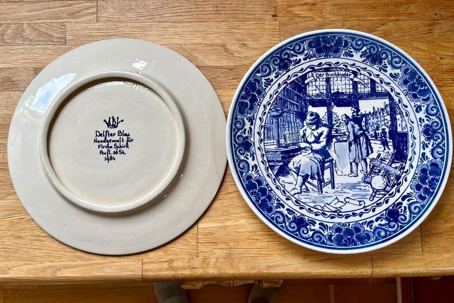 Två dekorativa tallrikar från Delfter Blau, handmålad för Firma Schirk, Auftl. 30 St. 1984.