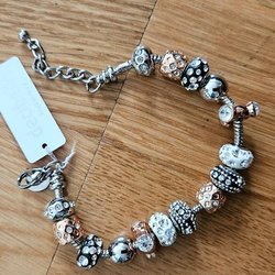 Tillverkad av tråd i silverfärg, glaszirkoner och akrylpärlor.