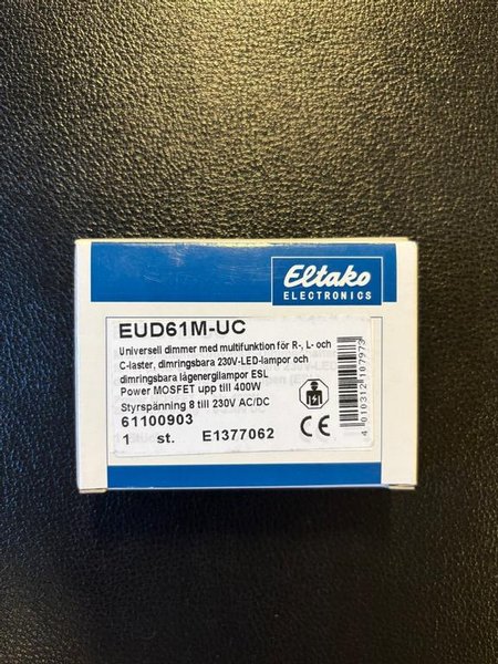 Eltako EUD61M-UC universell dimmer med multifunktion för R-, L- och C-laster. Den är kompatibel med dimringsbara 230V-LED-lampor och dimringsbara lågenergilampor (ESL). Dimmern har Power MOSFET-teknik och klarar upp till 400W. Styrspänningen är 8 till 230V AC/DC. Artikelnummer: 61100903, E1377062.