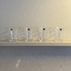 Fyra glas i olika utföranden. Två höga smala glas, ett mindre glas med fot och ett bredare glas med fot.