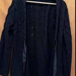 Svart kofta med flätstickade detaljer på ärmarna och ryggen. Koftan har en öppen design framtill med band som kan knytas. Den har en avslappnad passform och långa ärmar.