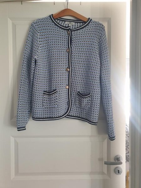 Klassisk kofta med ett intrikat mönster i blått, vitt och marin. Den har en rund halsringning, dekorativa fickor fram och knäpps med eleganta knappar.