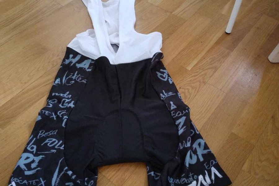 Cykelbyxor med hängslen i svart och vitt. Byxorna har ett mönster med text i ljusblått och vitt på sidorna. Hängslena är vita och perforerade för ventilation. Byxorna har en vaddering för ökad komfort under cykling. 36