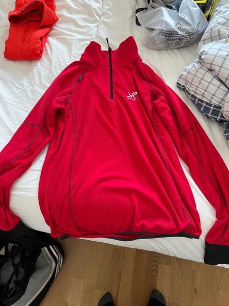 Röd tröja från Revolutionrace med halv dragkedja framtill och hög krage.
