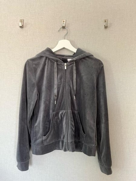 En grå huvtröja med dragkedja. Huvan är fodrad med ett mjukt tyg. Tröjan har fickor på magen.