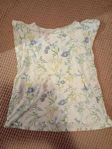 Vit kortärmad blus med blommigt mönster i blått, grönt, gult och rosa.