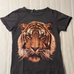 Grå t-shirt med ett tryck av ett tigeransikte på framsidan. Kortärmad.