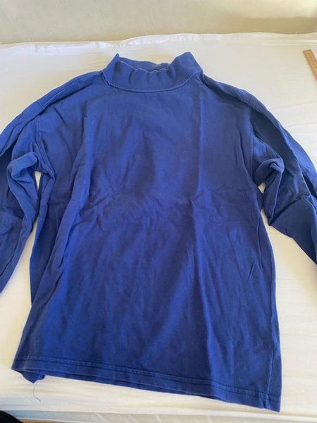 Tröja med långa ärmar och en hög krage. Plagget är enfärgat i en mörkblå nyans. Ärmarna och nederkanten har ribbade muddar. 55 cm lång i ryggen