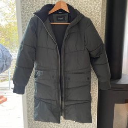 Ärmlös väst med dragkedja framtill och två fickor på bröstet. På baksidan finns en broderad text. Storlek S men stor i storleken. Passar sonen som har M eller mindre L.