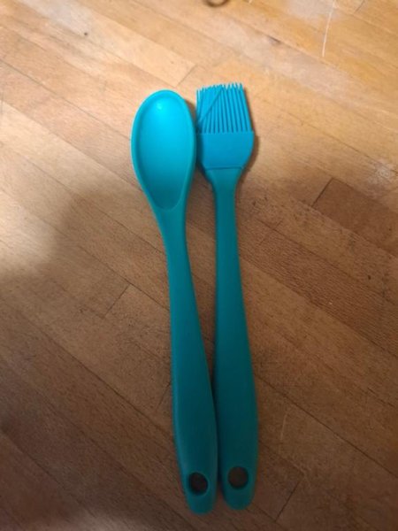 Ett set med två turkosa bakredskap i silikon. Setet innehåller en sked och en bakpensel.